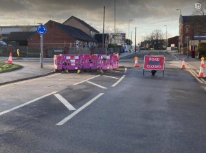 A first responder vehicle had to mount the grass verge in order to pass through the road.