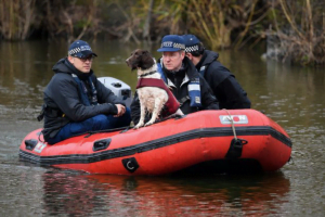 Police in a boat with a sniffer dog search Mount Pond on Clapham Common, PA