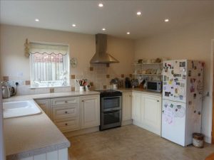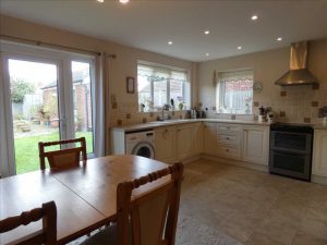 A well designed kitchen, featuring a range of base unit in a soft cream finish. Complimentary worksurfaces incorporate a sink with mixer taps and tile splash back. There is a freestanding cooker, with an overhead stainless steel extractor fan and light, a built in dishwasher and plumbing for an automatic washing machine. It has a laminate floor continuing through to the dining area. The kitchen has recessed spotlights, a radiator, dual aspect uPVC windows and a double glazed door, giving views and access onto the rear garden.