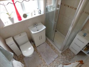 A modern shower room, with white suite comprising :- close couple w.c, a vanity unit with sink and double tiled walk-in cubicle with thermostatic shower, extractor fan and sliding glass door. Partly tiled, with a chrome heated towel rail, access to the loft space and a uPVC double glazed side window.