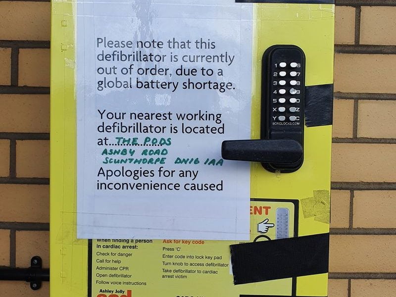 “Please note that this defibrillator is currently out of order, due to a global battery shortage.